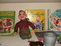 The museum is full of furniture and household items common to homes in the early 1950s that our residents would have owned. There is artwork, books, records, toys, clothes--including golashes, aprons, and cloth diapers--dishes and glassware, appliances and furniture. There are examples of Russell Wright, Fiesta Ware, Boontonware, Tupperware, Mirro Aluminum, hammered aluminum decorative and functional pieces, Homer Laughlin dishes, cookie cutters, cleaning products, dollhouses with furniture and a toy metal barn with farm animals, anodized aluminum tumblers, pitcher and bowls, a 1947 GE Refrigerator, a bathinette, and more.